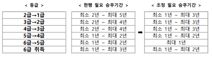 개정안에서는 국제협약 기준에 부합하는 범위에서 등급별로 승무기간을 최대 2년 단축하여 하위 등급의 해기사면허 소지자가 상위 등급의 해기사면허를 취득하는 데에 걸리는 기간을 대폭 줄였다.