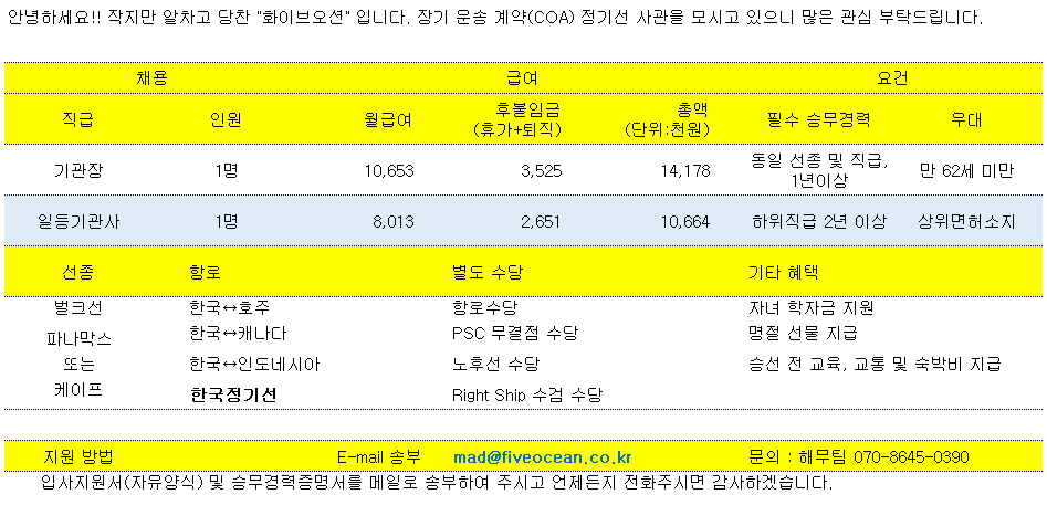(주) 화이브오션은 해운 부정기선 분야에서 국내 및 해외 유수의 업체들과 협력 사업을 펼치고 있는 해운 중견 업체 입니다.