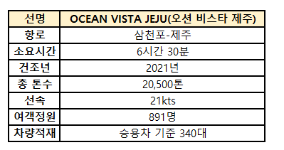 현재 삼천포↔제주 항로에 2021년 3월 신조한 20,500톤급 "오션비스타 제주"호가 투입되어 운항중입니다.