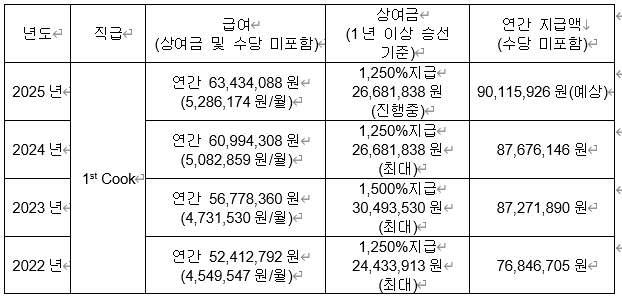 4) 최근 4년간 조리수 급여 및 상여금 지급 내역(최대)